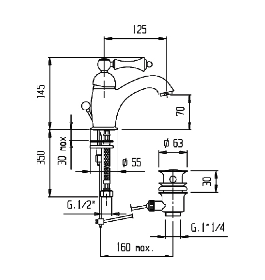 Комплектация: смеситель, гибкая подводка, донный клапан;
