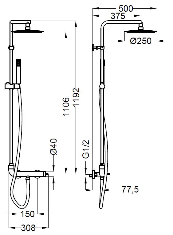 Комплектация: фиксированная неповоротная штанга высотой 1192 мм, верхний тропический душ диаметром 250 мм, кронштейн верхнего душа с поворотным шарниром, смеситель для душа, 1-режимная душевая лейка, регулируемый по высоте держатель душевой лейки, гибкий шланг длиной 1500 мм, соединение шланга 1/2 дюйма;