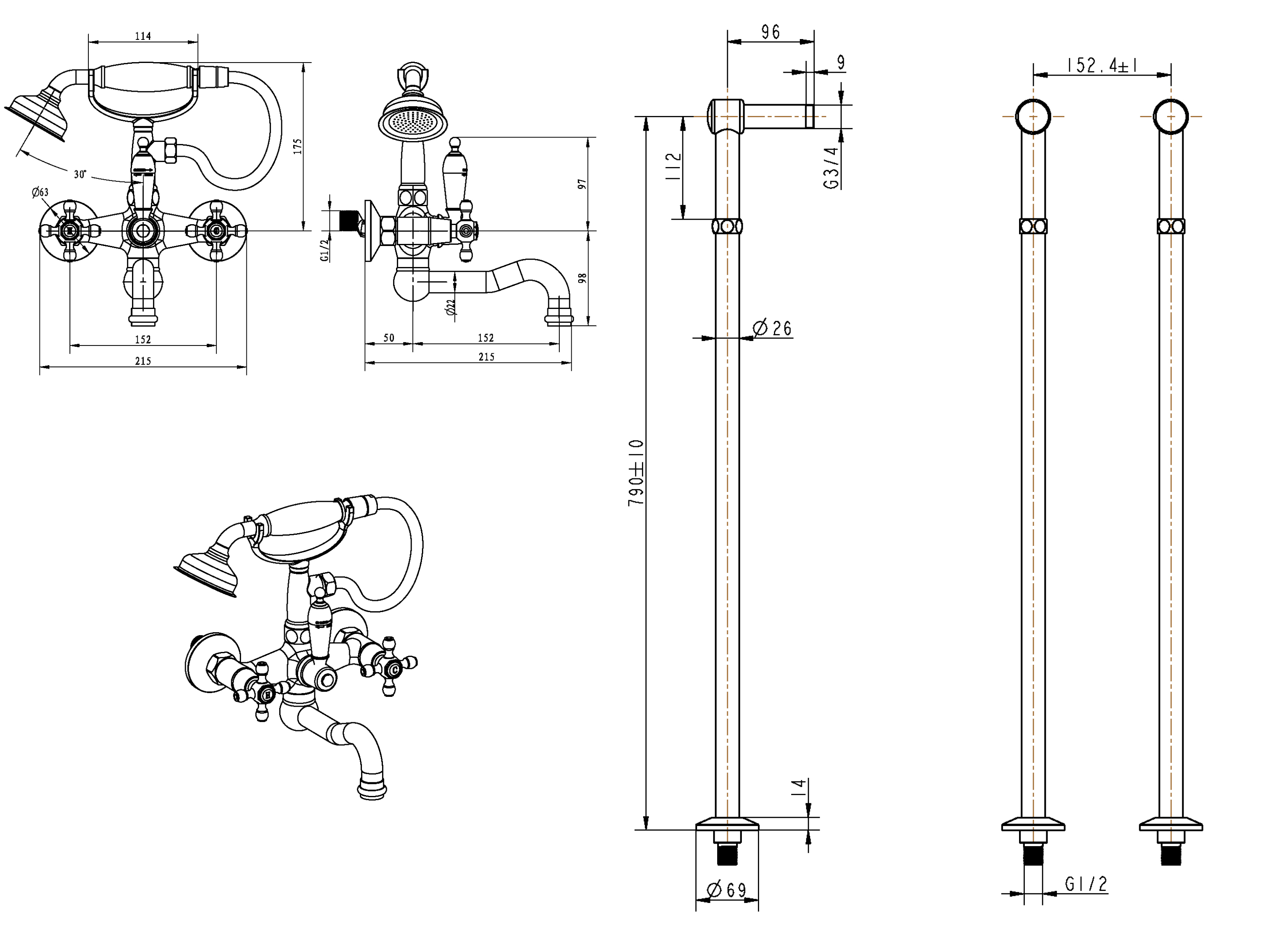 Размеры, (мм): межосевое расстояние - 152, высота "ножек" - 780-800;